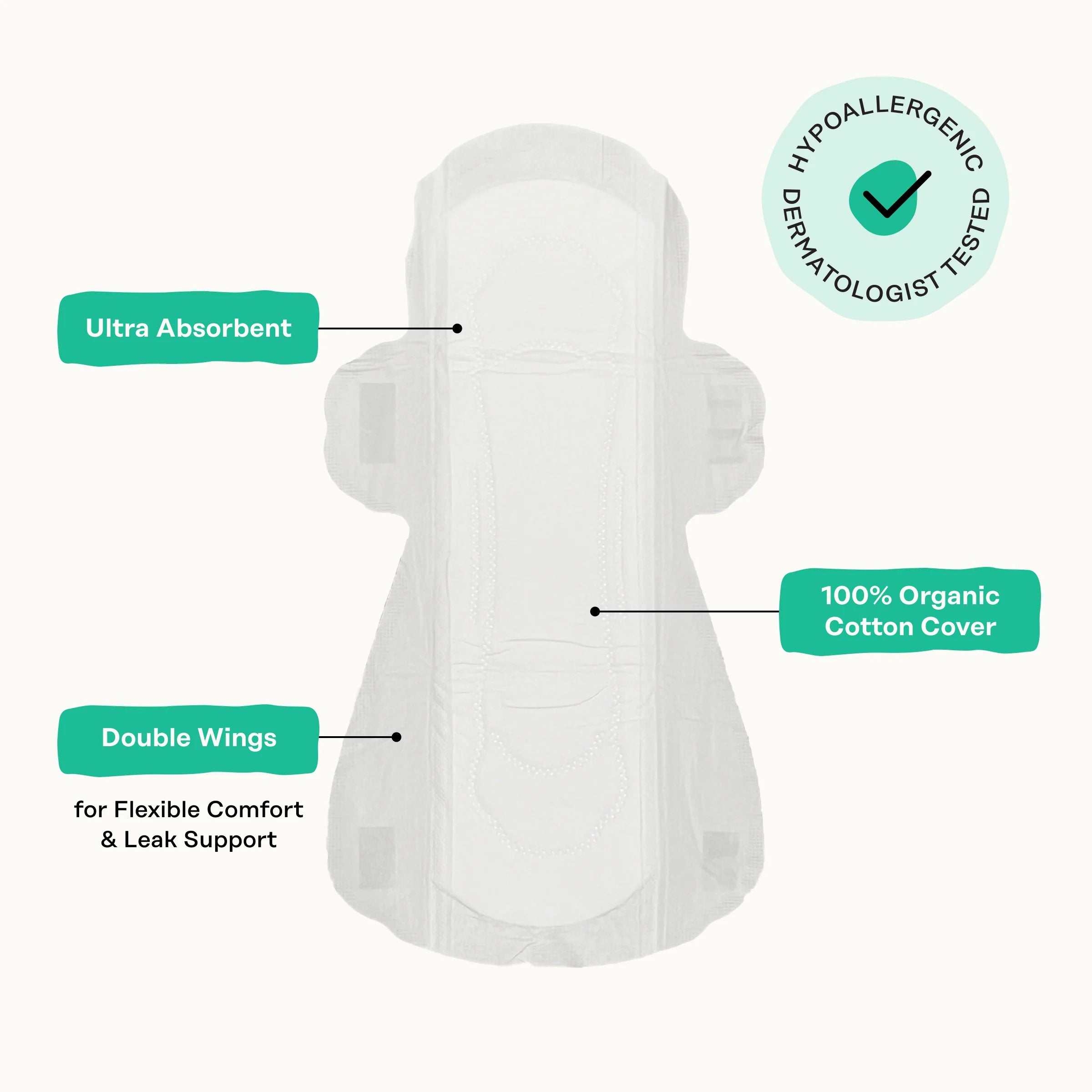 Elemental Chlorine-Free Natural Wood Pulp (Absorption), Certified Organic Cotton (Top Sheet), Polyethylene (Absorption), Hot Melt Adhesive (Adheres Pad Layers), Polypropylene (Absorption), Sodium Polyacrylate (Absorption), Polyethylene and Polyethylene Terephthalate (Nonwoven Leak Guard)