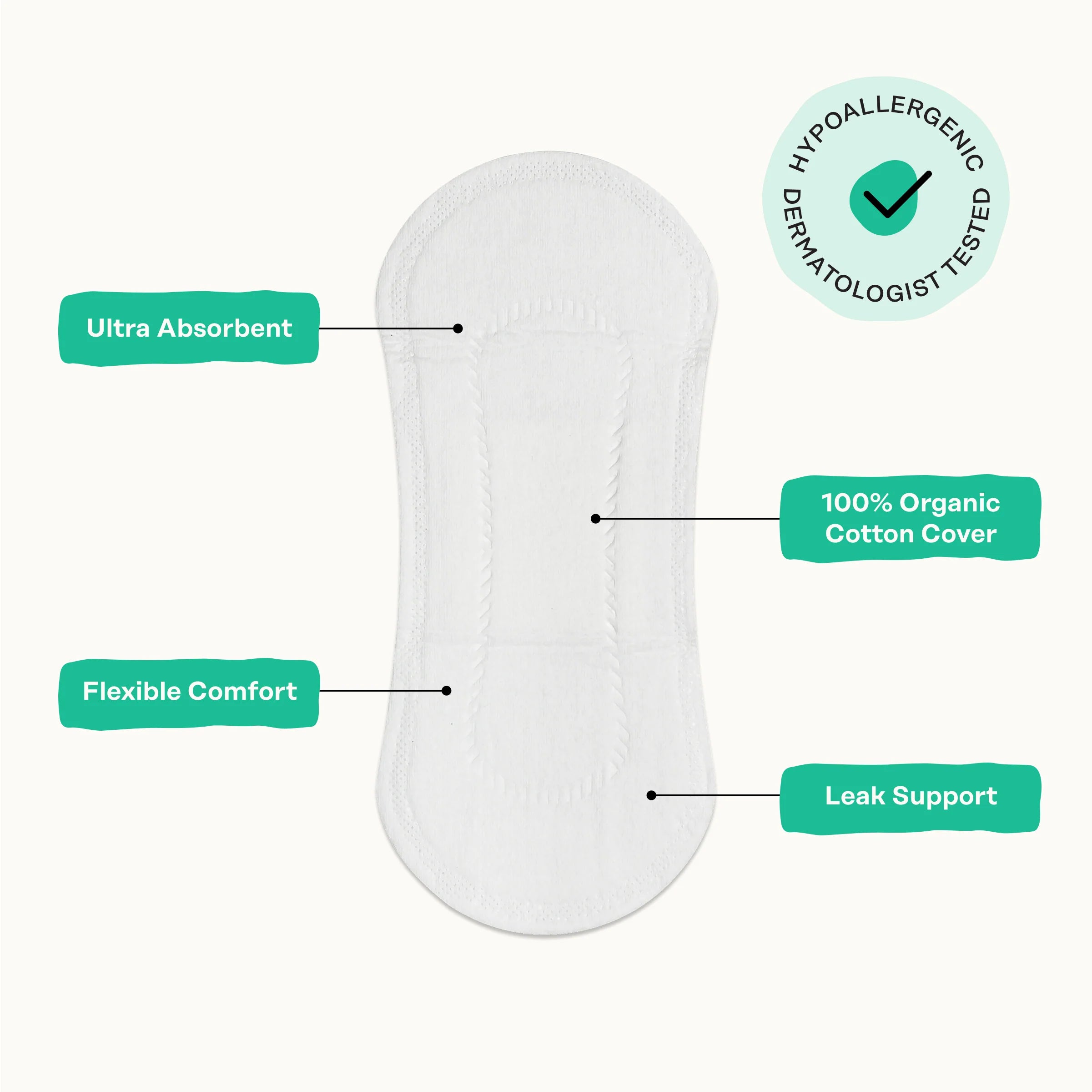 Elemental Chlorine-Free Natural Wood Pulp (Absorption), Certified Organic Cotton (Top Sheet), Polyethylene (Absorption), Hot Melt Adhesive (Adheres Pad Layers), Calcium Carbonate (Improves Backsheet Airflow), Polypropylene (Absorption), Sodium Polyacrylate (Absorption).
