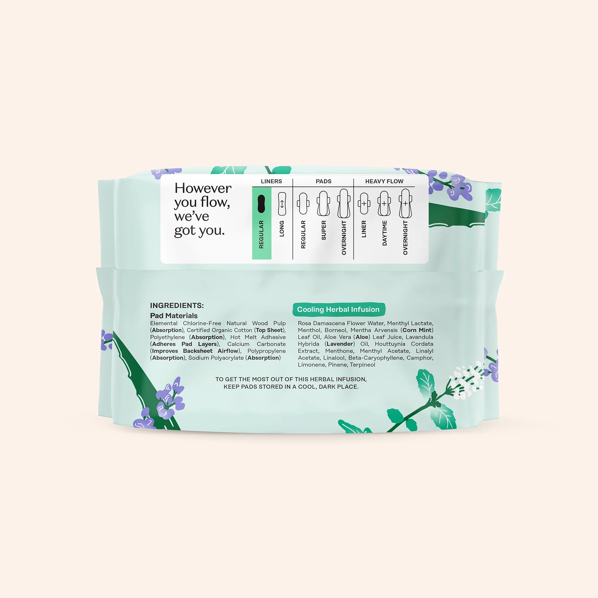 Hit refresh on period discomfort. Our Cooling Herbal Infusion Liners are made with a unique herbal blend of Mint, Aloe Vera, and Lavender that provides a one-of-a-kind refreshing, cooling sensation on those hot and heavy period days. A 100% organic cotton cover and ultra-absorbent core provide the softness and protection you expect from Honey Pot period care products. Cooling Herbal Infused Pads will make you say “Ooh! Ahh...” in the best way.